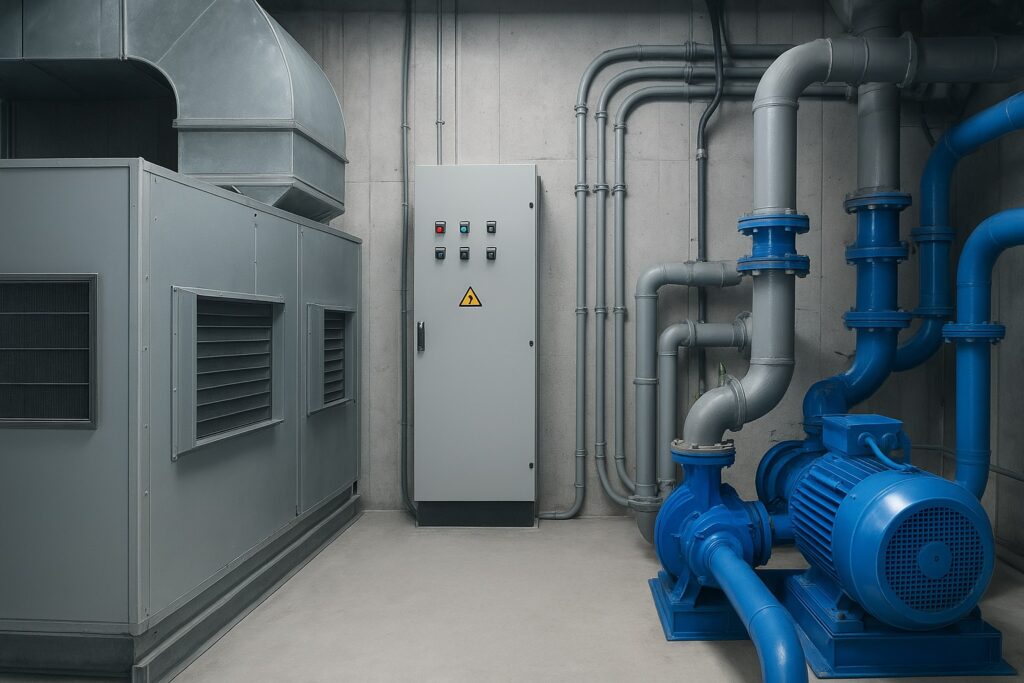 - Mechanical systems – HVAC systems, ventilation, firefighting, pumps, and water systems